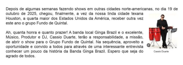Artigo anteriorO extraordinário, Grupo Fundo de Quintal, em Houston Texas, dia 19 de Outubro.