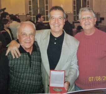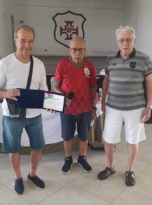 O primeiro é o Sr. William, representante da Prefeitura, já falecido; ao centro, o nosso homenageado “Palito”; e, à direita, Soneca, ex-atleta profissional de futebol do Santos FC.