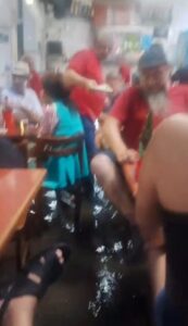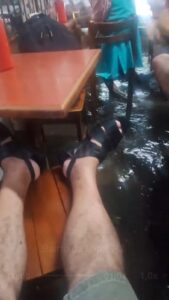 Sentados à mesa, com seus copos de cerveja ou de chope, acompanhavam a cena e tratavam de evitar que seus pés ficassem molhados, retirando-os prudentemente das águas que insistentemente subiam seus níveis, e invadiam arteiramente o recinto que os abrigava, enquanto muita gente, que fazia parte do encontro extremamente alegre do local, passava apressada para não se molhar.