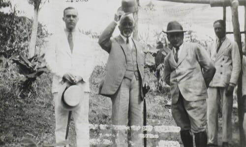Teodoro Sampaio (ao centro) visita os campo petrolíferos de Lobato (BA), os primeiros do Brasil.